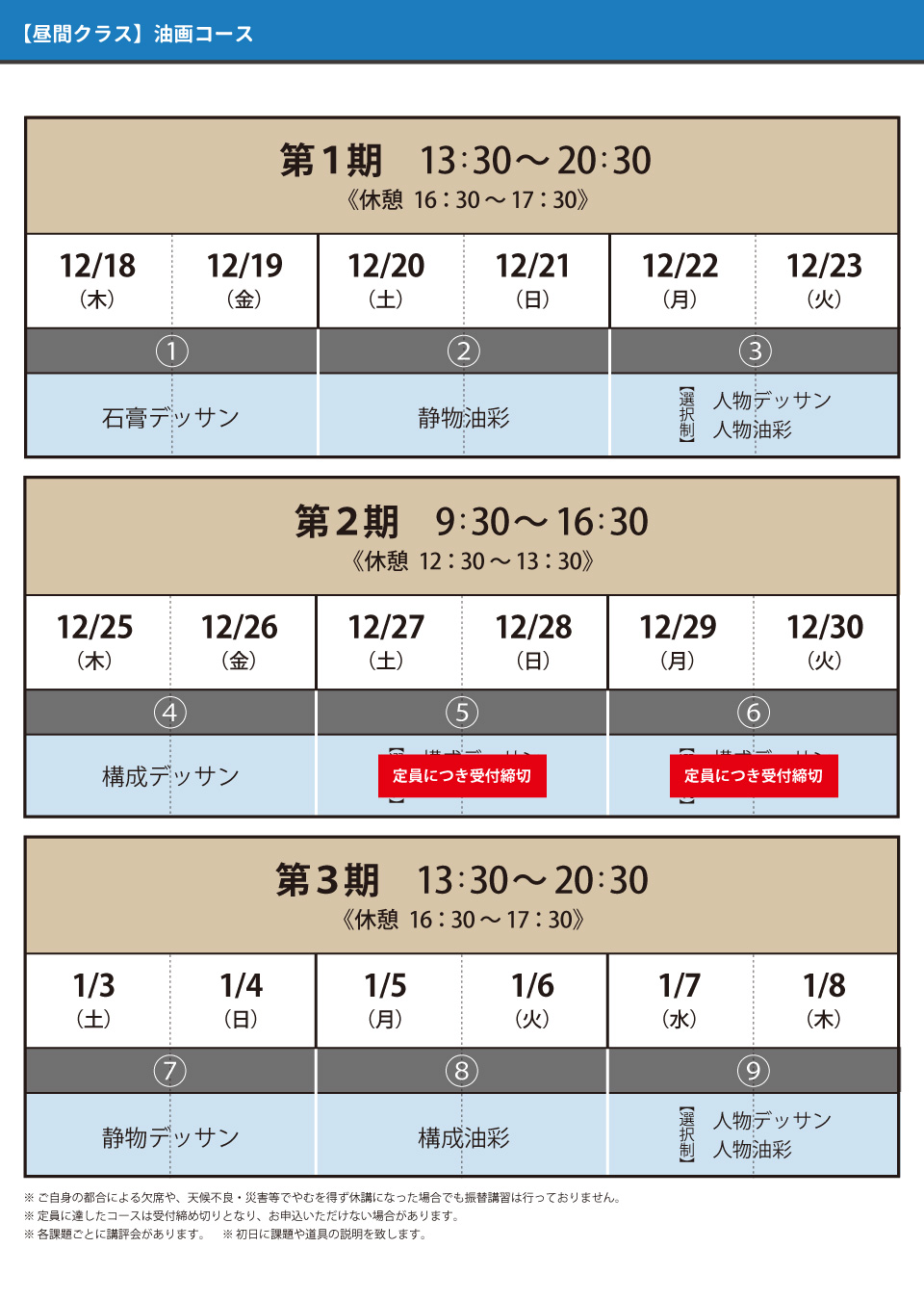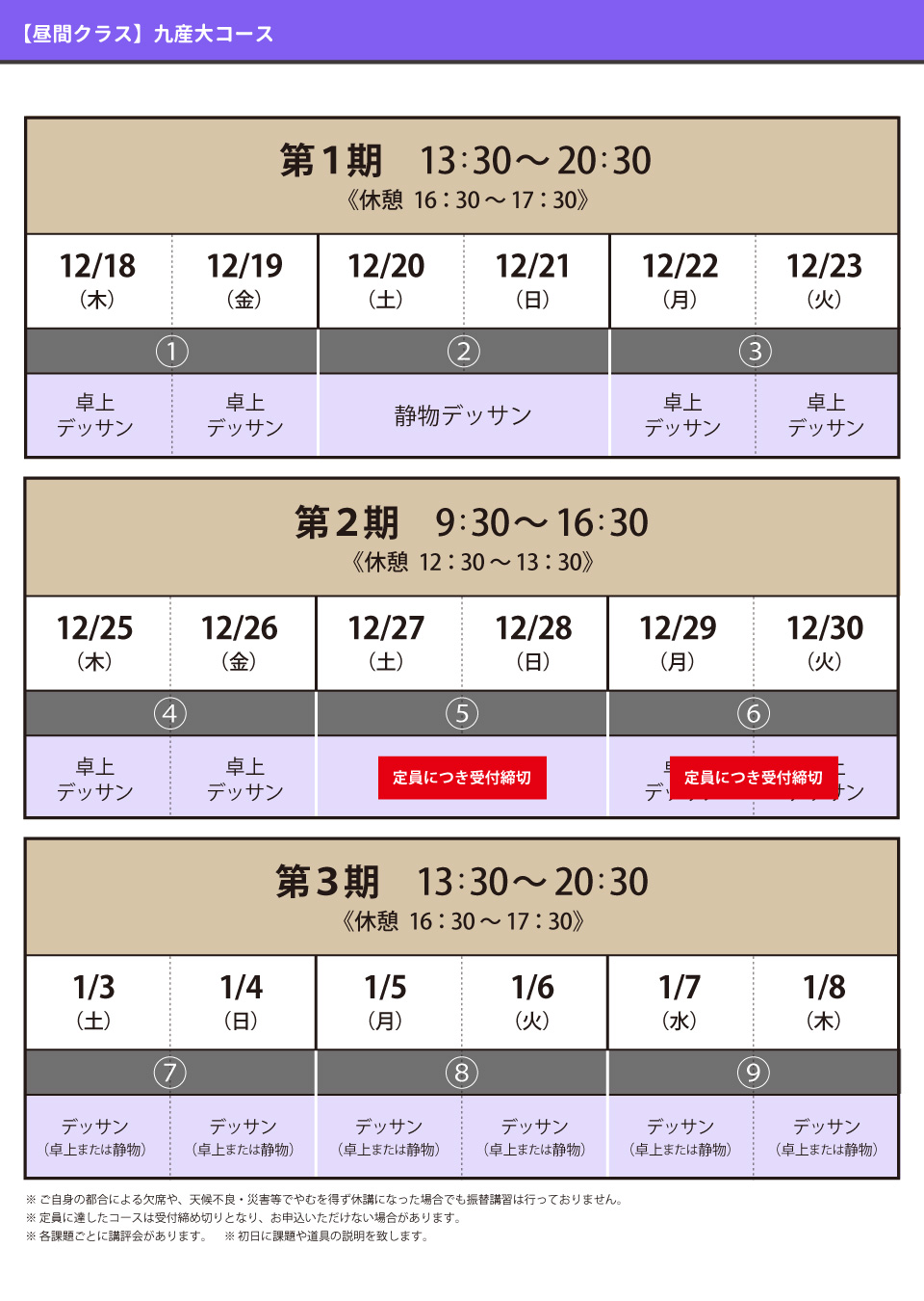 【第1期】 【第2期】 [期間] 12/25(木)〜12/30(火) [時間] 9:30〜16:30 (実技6時間) 【第3期】 [期間] 2026.1/3(土)〜1/8(木) [時間] 13:30〜20:30 (実技6時間) |