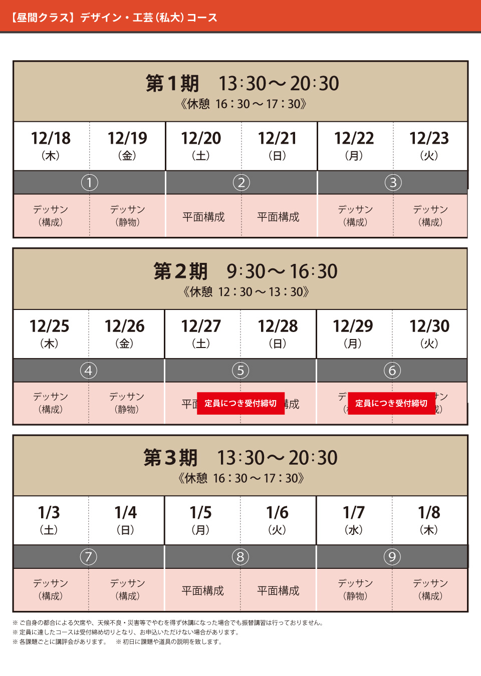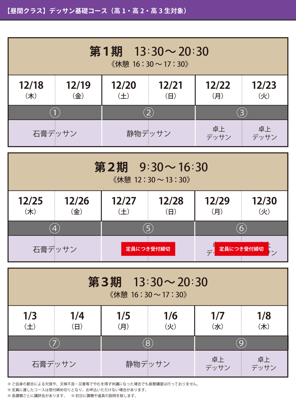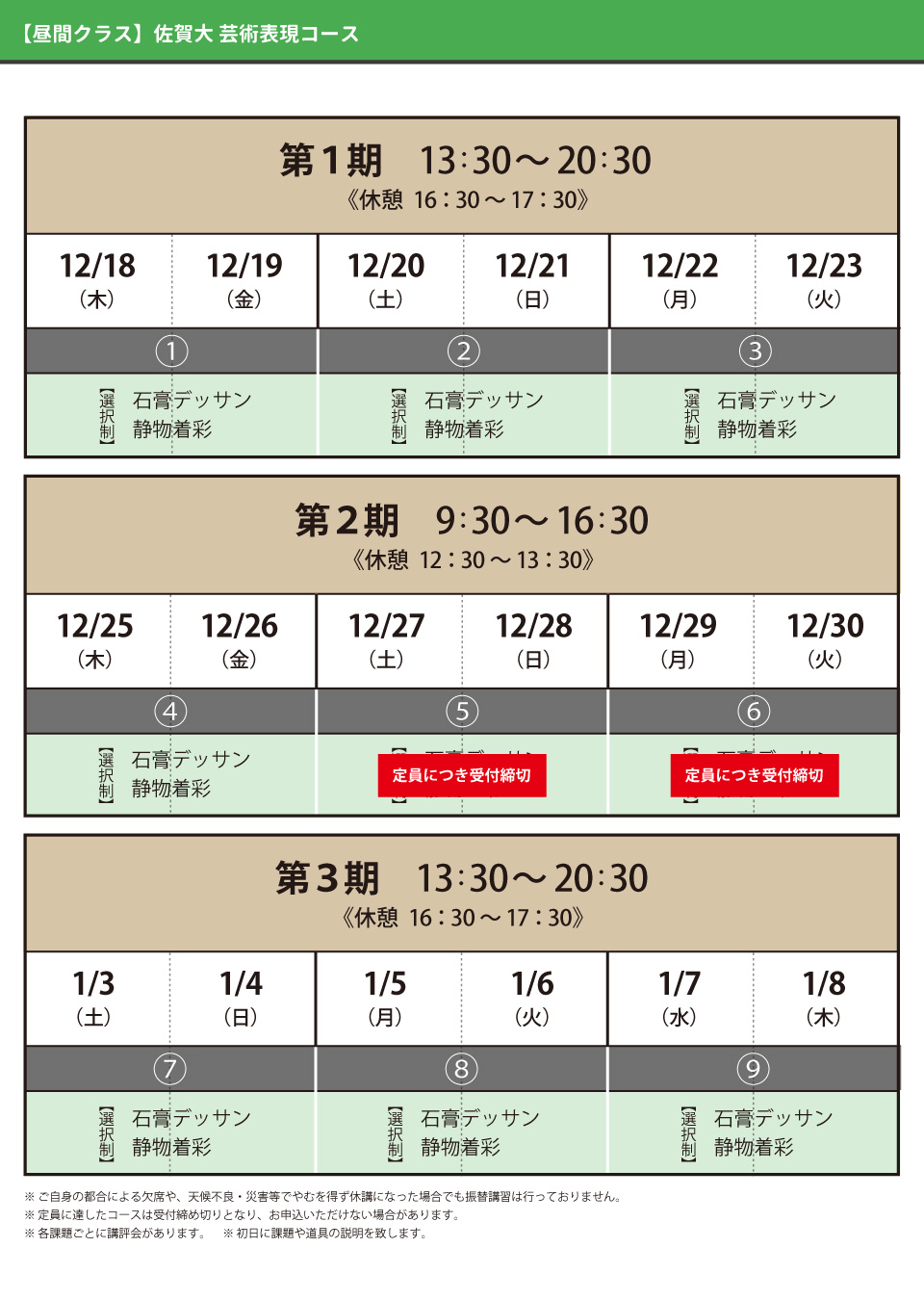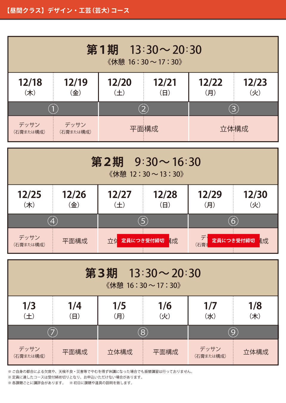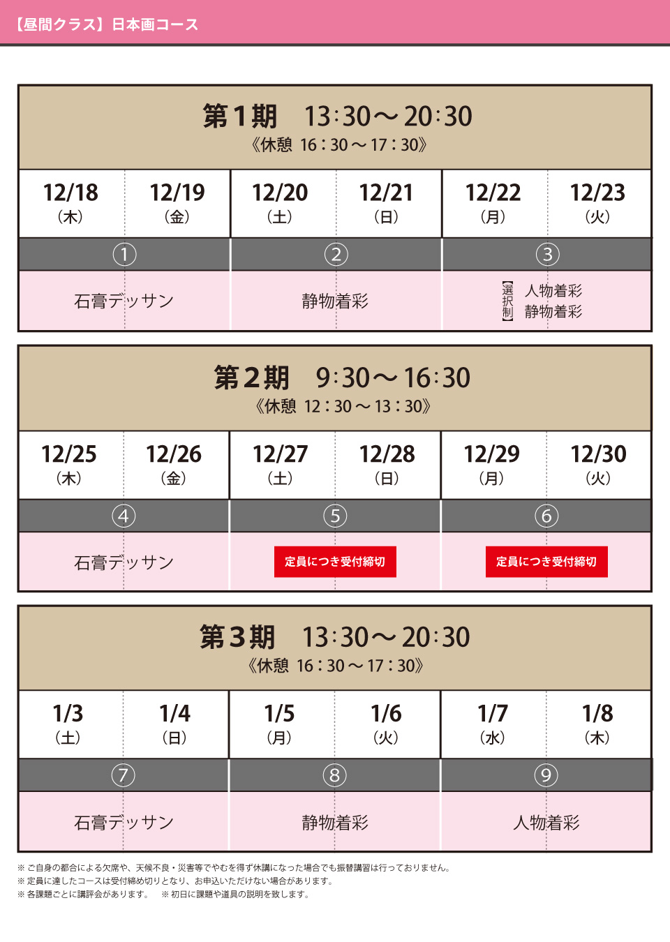 【第1期】 【第2期】 [期間] 12/25(木)〜12/30(火) [時間] 9:30〜16:30 (実技6時間) 【第3期】 [期間] 2026.1/3(土)〜1/8(木) [時間] 13:30〜20:30 (実技6時間) |